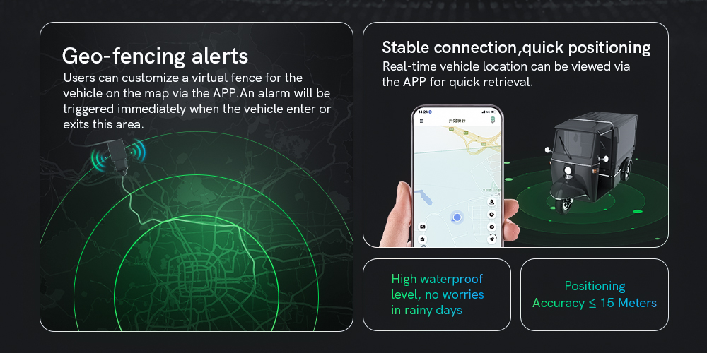 1. 遠(yuǎn)程開(kāi)關(guān)鎖:無(wú)需親自接觸車輛,通過(guò)手機(jī)APP即可實(shí)現(xiàn)車鎖的開(kāi)關(guān),極大提高了使用的便利性 2. 電子圍欄:用戶可以通過(guò)APP在地圖上為車輛定制一個(gè)虛擬圍欄,當(dāng)車輛超出或者進(jìn)入該區(qū)域時(shí),會(huì)立即向平臺(tái)發(fā)出警報(bào) 3. 提高配送效率?:通過(guò)精確的路徑規(guī)劃和車輛調(diào)度,實(shí)現(xiàn)24小時(shí)不間斷配送,減少交通擁堵,提高配送效率。? 4. 實(shí)時(shí)監(jiān)控與數(shù)據(jù)分析?:提供實(shí)時(shí)監(jiān)控和數(shù)據(jù)分析功能,優(yōu)化車輛調(diào)度,提升管理效率,減少管理成本